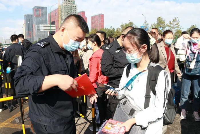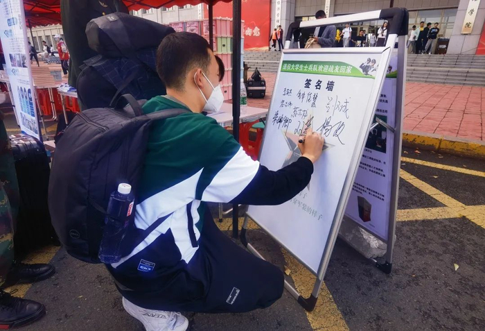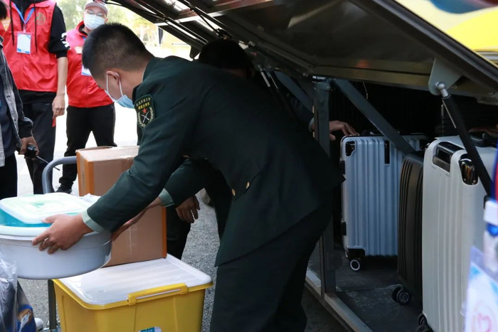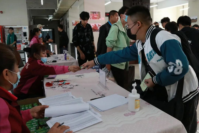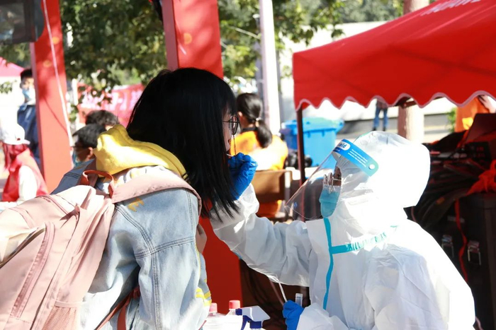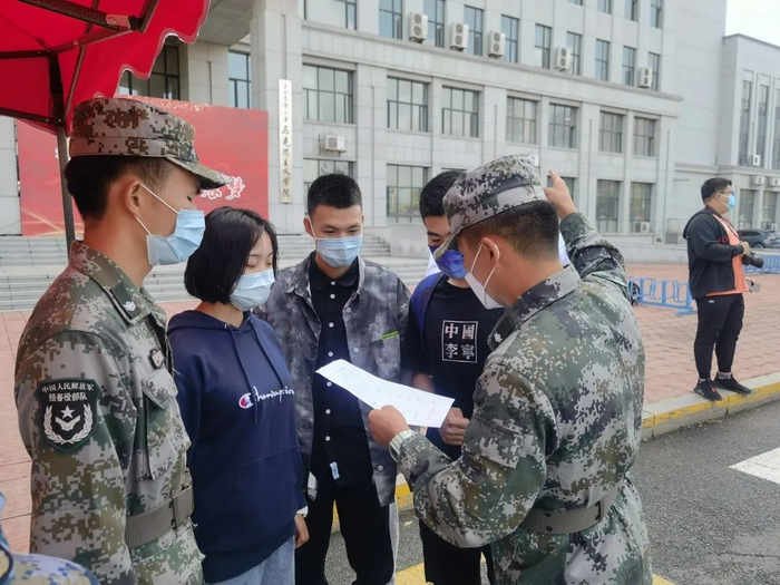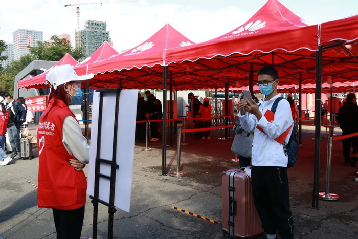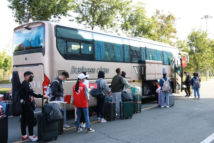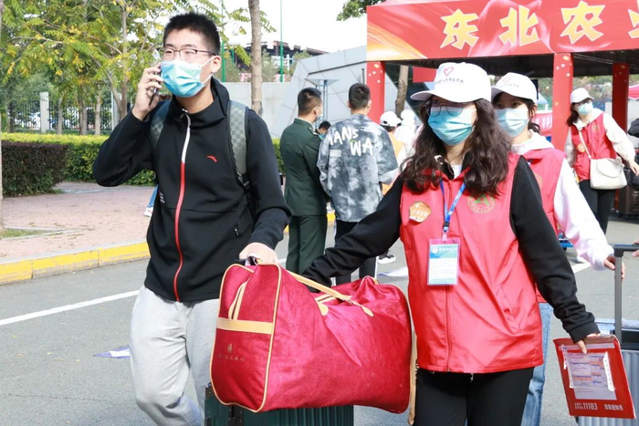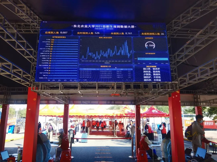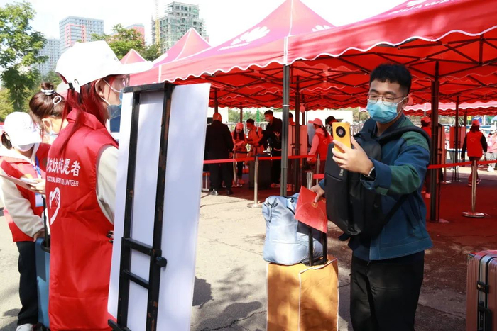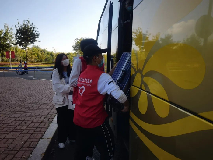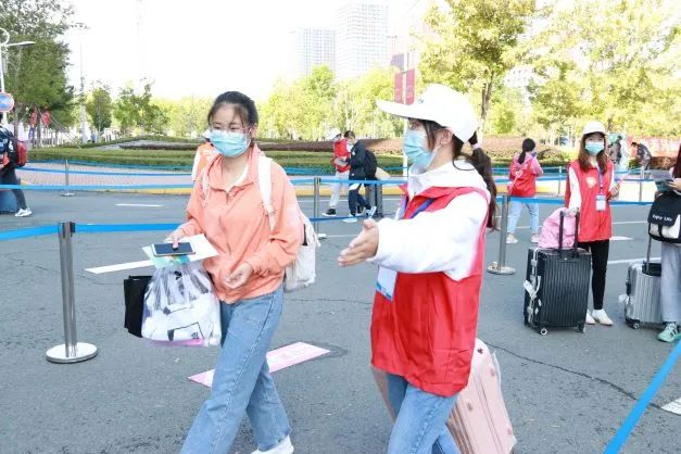 进入学校报到的新生,在北门入口检查录取通知书、“大数据行程码”“龙江健康码”和核酸报告,进入校园后扫描“今日校园”APP报道码,进行核酸检测,乘校内转运车到达寝室。