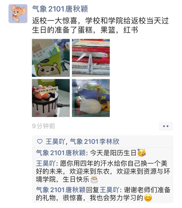 学校还为新生报到当天过生日的35名同学准备了生日蛋糕和生日礼物,愿你们与东农一起长大。