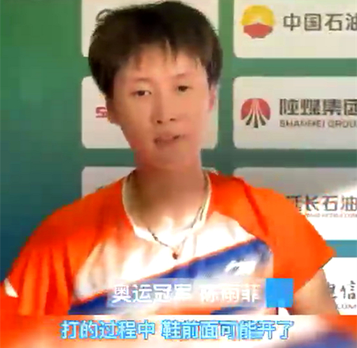 令人意外的是,赛后陈雨菲接受采访时透露,自己受伤是运动鞋鞋头突然开裂,被一根不知道是线还是钢丝的东西划开脚趾,换了鞋才好一点。“打的过程中鞋前面可能开了,里面那个钢丝就戳到我的脚,会影响发挥但尽量克服,特别是往前冲的时候就会顶,所以换了一双之前的鞋穿着打,多少比之前的好一点。”