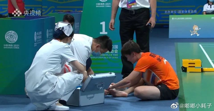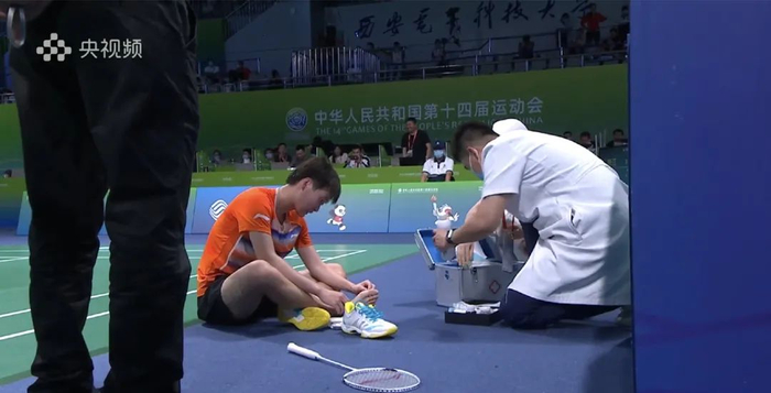 昨天(9日)进行的第十四届全国运动会羽毛球比赛女团小组赛,浙江队陈雨菲对战福建队韩悦。但到第二局,陈雨菲因运动鞋造成右脚大脚趾受伤,申请医疗暂停,只能换鞋继续比赛。赛后陈雨菲透露伤情称,比赛过程中可能是右脚的鞋头开了,她的大脚指被“钢丝”戳到。