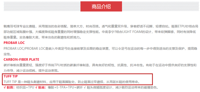 产品介绍显示其使用了一种名为“TUFF TIP”的鞋头耐磨材料,应用于鞋面脚趾处,宣称可以防止鞋面过早磨损,从而延长鞋的使用寿命。
