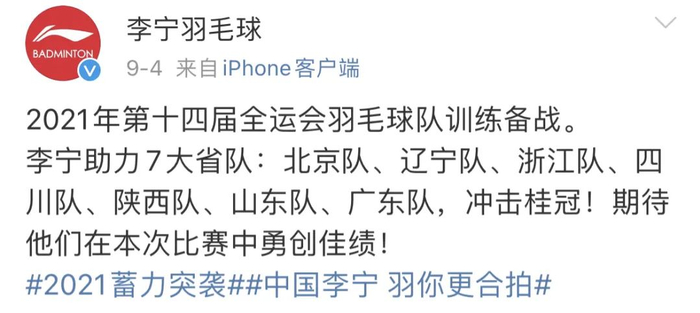 根据@李宁羽毛球 的博文,李宁品牌赞助了今年参加全运会的7个省队,其中就包括了陈雨菲所在的浙江队。