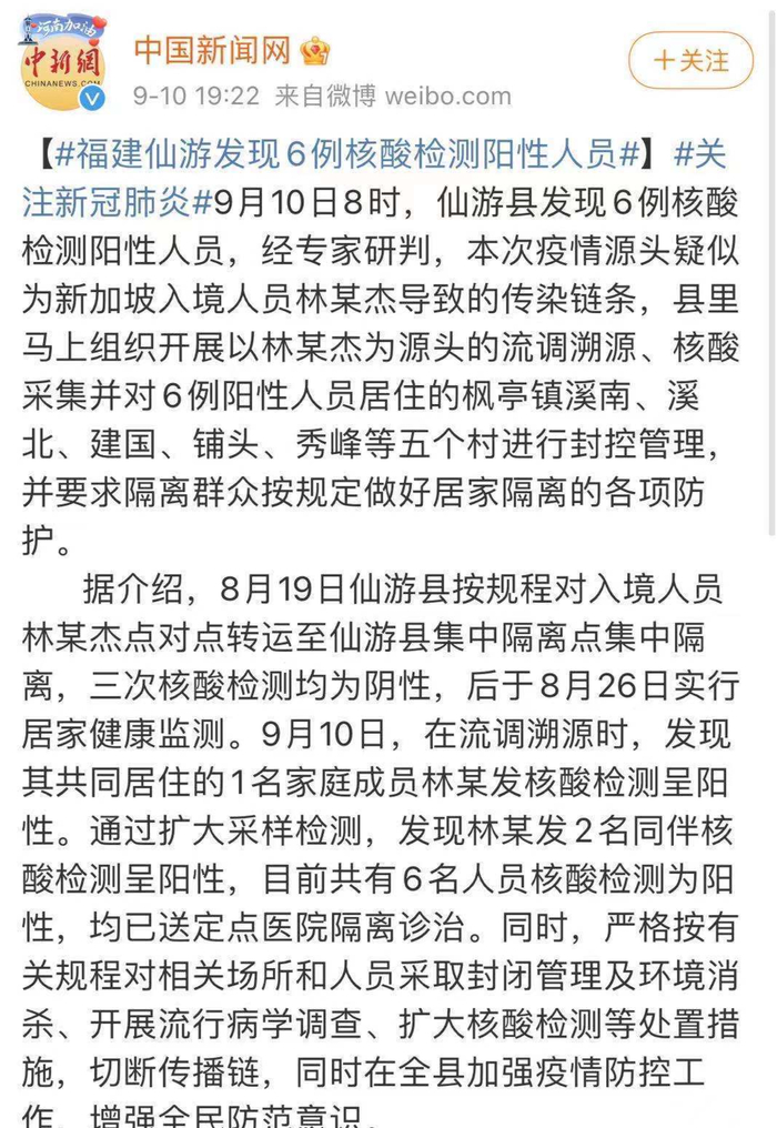 据中国新闻网等媒体报道,仙游应对新型冠状病毒感染肺炎疫情工作指挥部发布通告称,9月10日8时,福建省仙游县发现6例核酸检测阳性人员,经专家研判,本次疫情源头疑似为新加坡入境人员林某杰导致的传染链条。