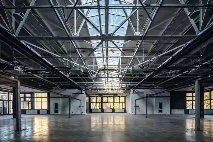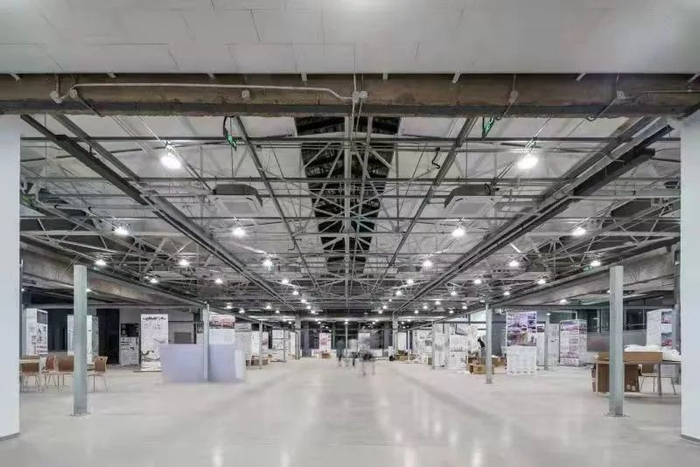 室内维持了原有大空间并保留了钢桁架及工业混凝土板, 秉持最小干预原则,保留了建筑的时代印记。