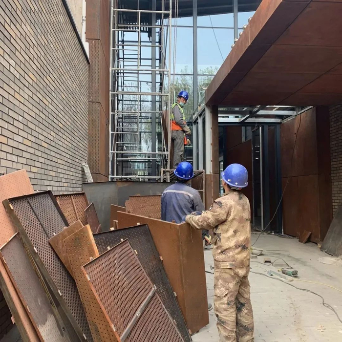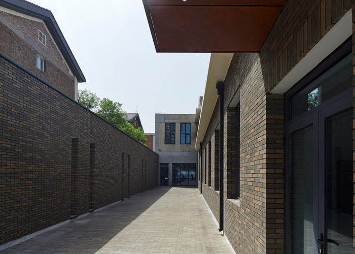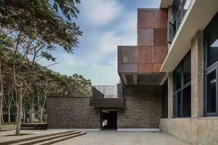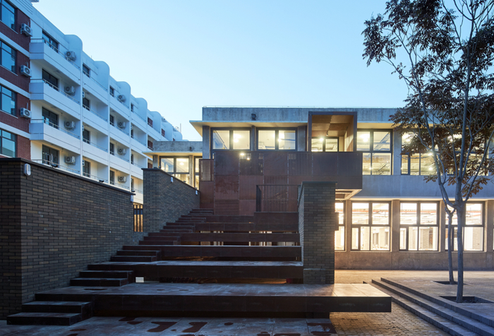 建筑沿路新砌的墙面及装饰所用的锈蚀钢板,充分呼应原有建筑及周边宿舍外檐色彩,新旧元素相映,与校园建筑风格一脉相承。