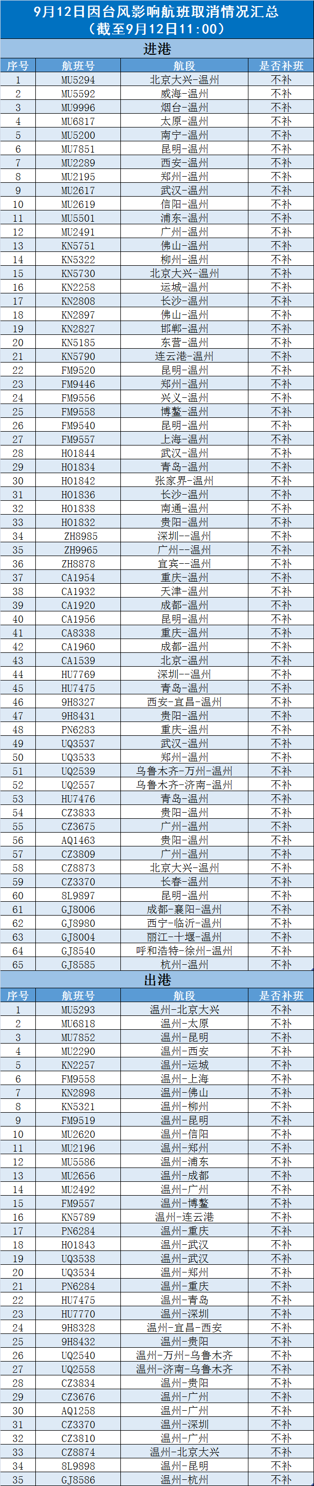 温州机场已启动防汛防台应急预案四级响应。截至今天上午11时,9月12日温州机场共计取消航班100架次,其中进港65架次,出港35架次。