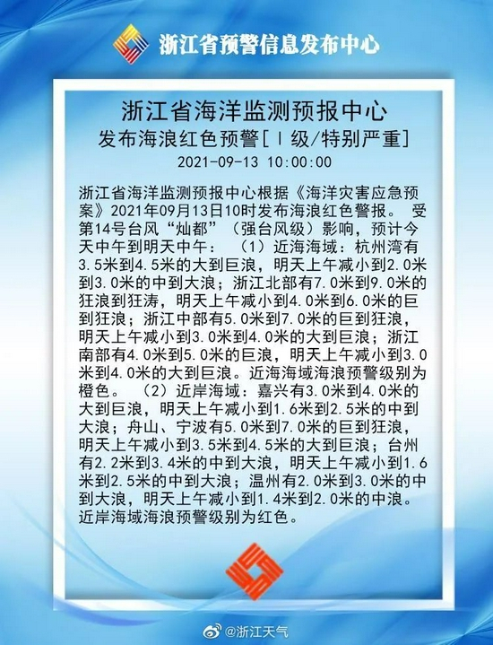 海浪红色预警[Ⅰ级/特别严重]