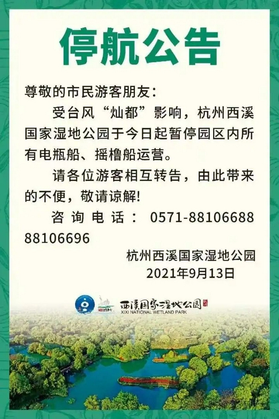 9月13日一早,杭州西湖风景名胜区发布最新公告称:因受强台风“灿都”影响,西湖水域无法满足船舶航行要求,即日起西湖游船公司所有船舶停止航行,后续将根据天气情况复航,复航公告请关注“西湖游船公司”微信公众号。杭州西溪湿地国家公园也发布公告,于今日起暂停园区内所有电瓶船、摇橹船运营。