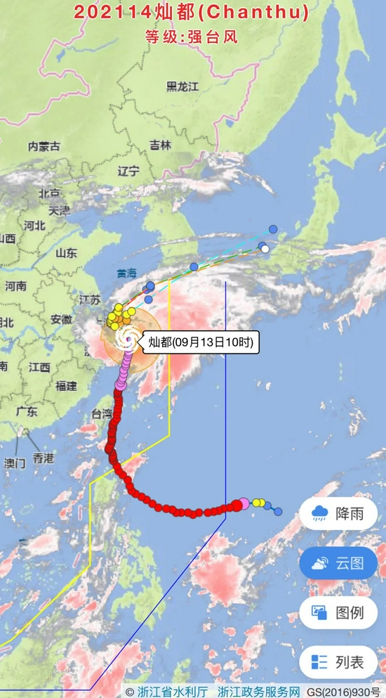 @浙江天气:预计“灿都”将以每小时20 公里的速度向北偏西方向移动,将于今天中午到下午穿过舟山群岛,之后在杭州湾到长江口一带回旋少动,也可能在上海浦东到江苏启东一带登陆,16日开始转向东北方向移动。