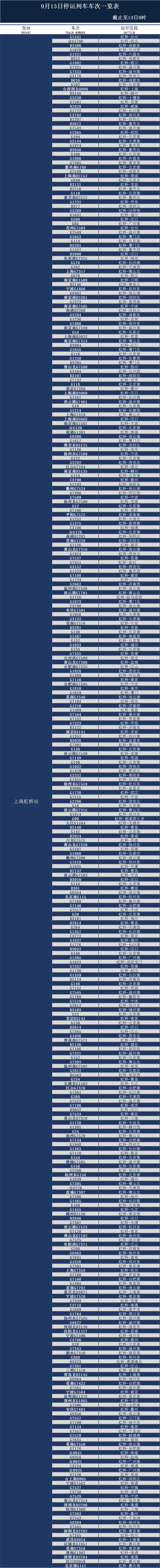 截至9月13日8时,铁路上海站当日598趟列车停运。其中,上海站停运139列、上海南站停运106列、上海虹桥站停运353列。具体停运车次详见↓