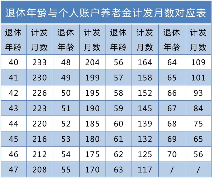 个人账户养老金=个人账户累计储存额÷退休年龄对应的计发月数: