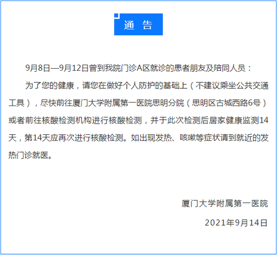 为了您的健康,请您在做好个人防护的基础上(不建议乘坐公共交通工具),尽快前往厦门大学附属第一医院思明分院(思明区古城西路6号)或者前往核酸检测机构进行核酸检测,并于此次检测后居家健康监测14天,第14天应再次进行核酸检测。如出现发热、咳嗽等症状请到就近的发热门诊就医。