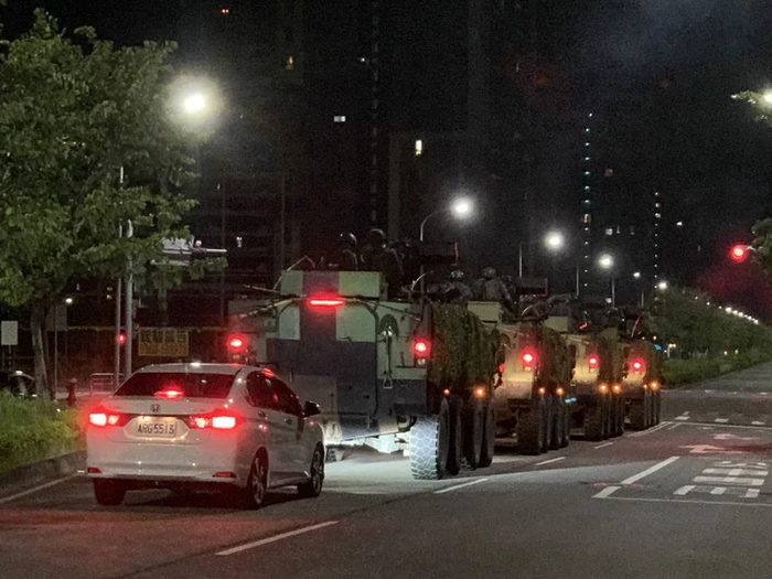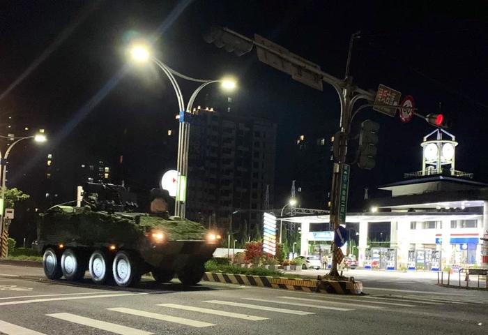 台陆军关渡指挥部装骑部队所属云豹装甲车13日深夜机动进驻淡水河口要地,14日晨将配合实施淡水河口“反渗透、反突击”操演。图自“联合新闻网”,下同