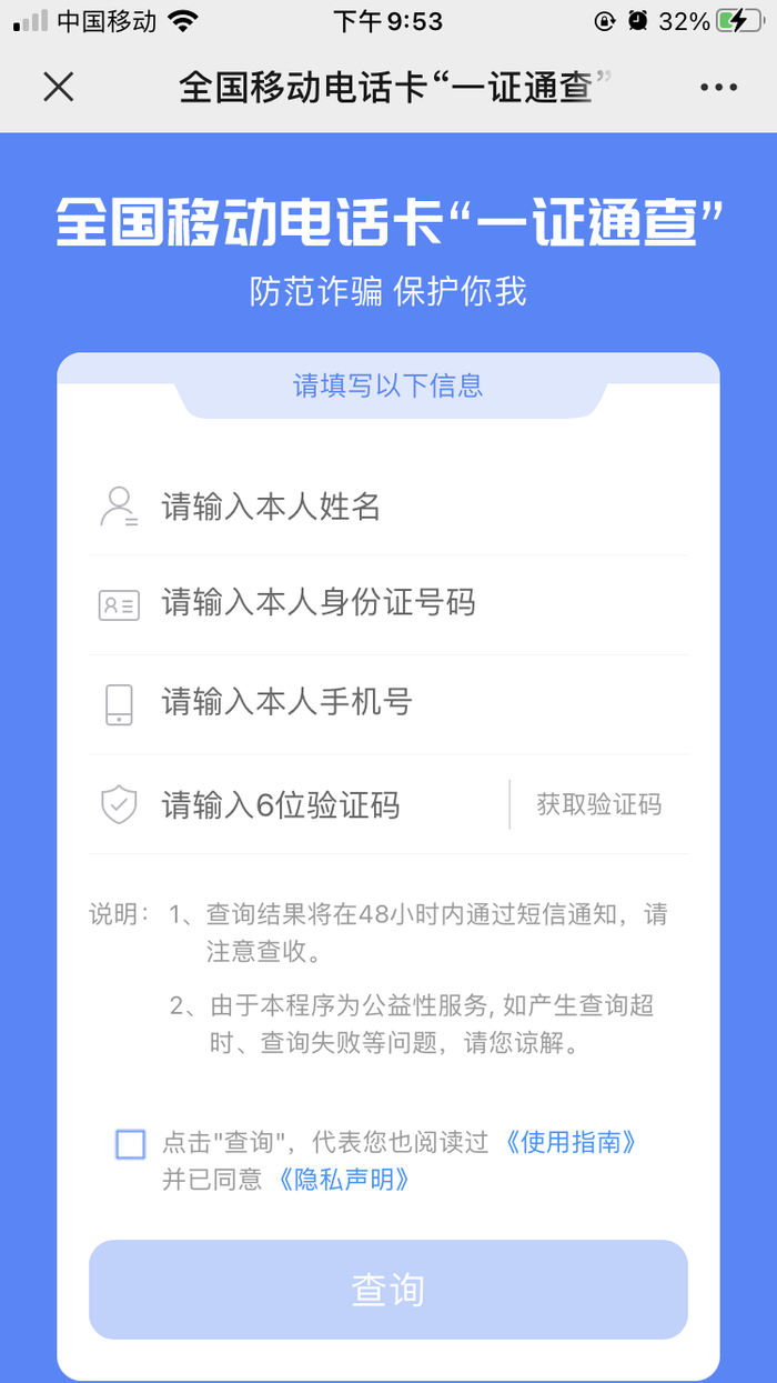 ● 为了成功使用本服务,用户需要提供本人的身份证号码、以及该身份证下登记的任一手机号码等信息。若查询不成功,要进一步核对信息,并在24小时后重新查询。