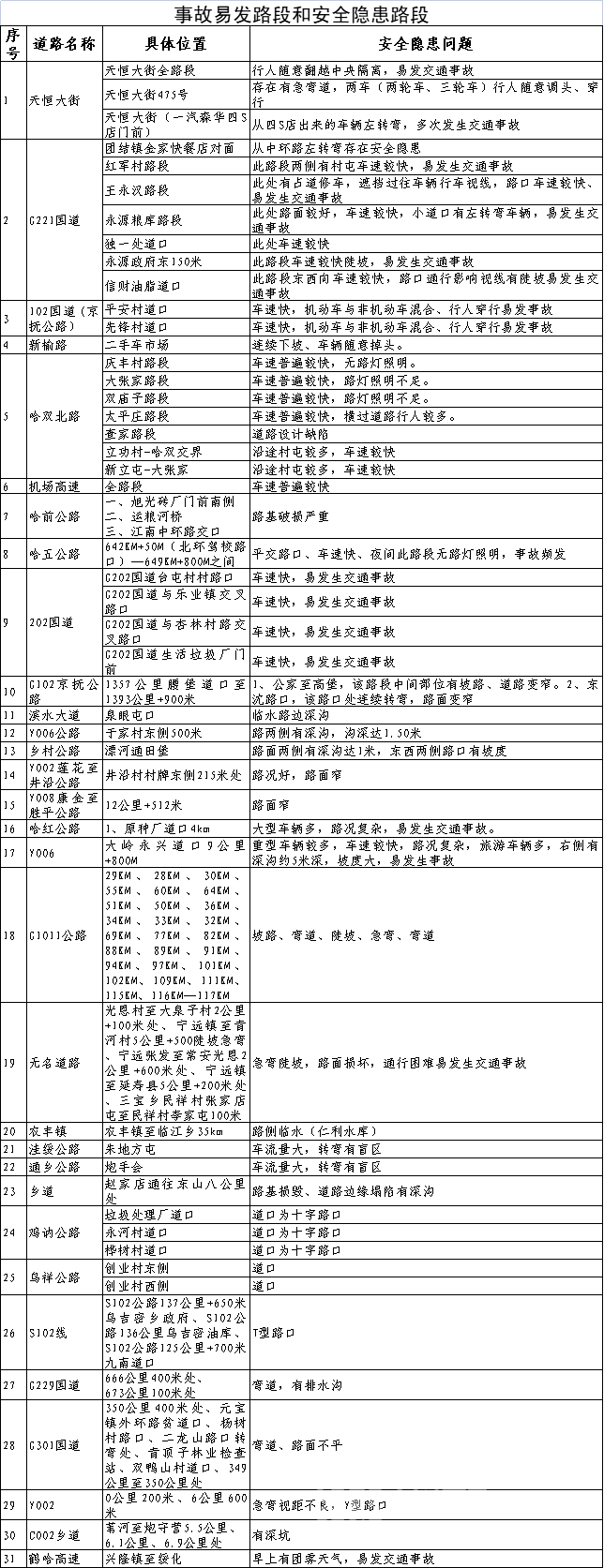 针对节日期间部分区域人流、车辆密集,农村公路车流量大幅上升,恶劣天气给交通带来不利影响等相关预警,交警部门发布哈市事故易发路段和安全隐患路段,提示市民行经以下路段应减速慢行,注意交通安全。