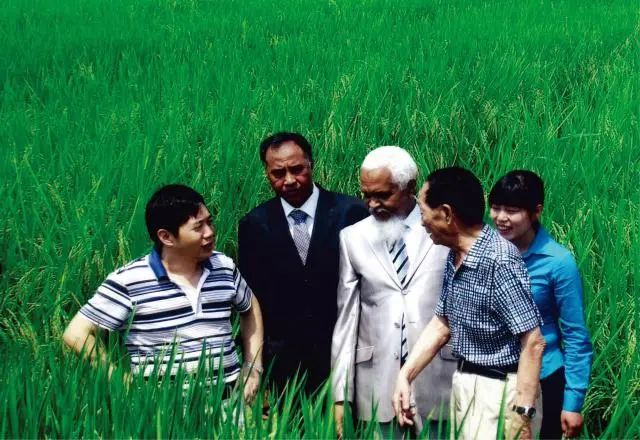 袁隆平与马达加斯加朋友在杂交水稻稻田里