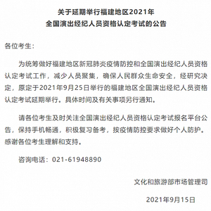 原标题:福建地区2021年全国演出经纪人员资格认定考试延期举行