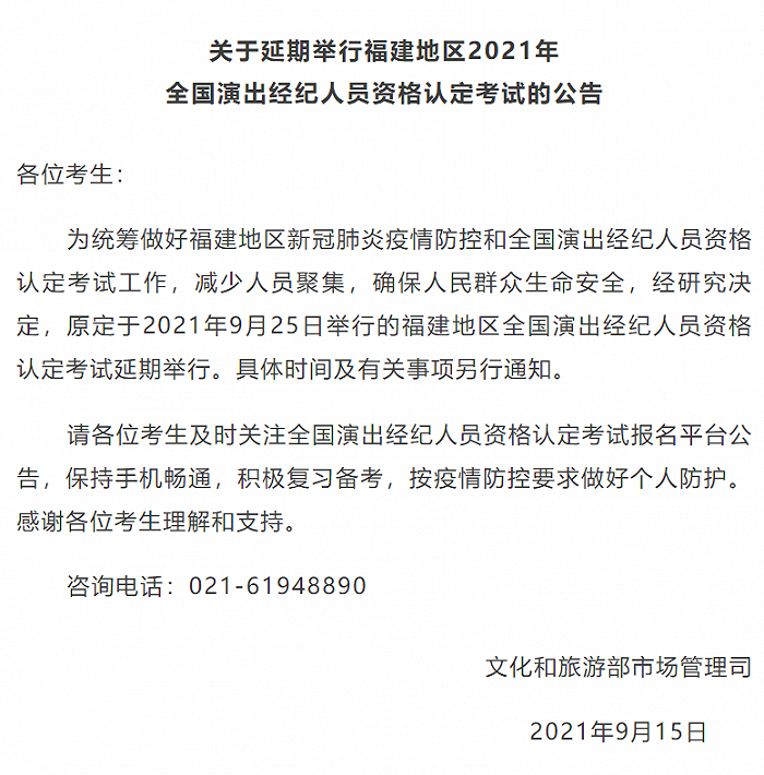 据中国演出行业协会微信公众号消息,9月15日,文化和旅游部市场管理司发布公告:为统筹做好福建地区新冠肺炎疫情防控和全国演出经纪人员资格认定考试工作,减少人员聚集,确保人民群众生命安全,经研究决定,原定于2021年9月25日举行的福建地区全国演出经纪人员资格认定考试延期举行。具体时间及有关事项另行通知。