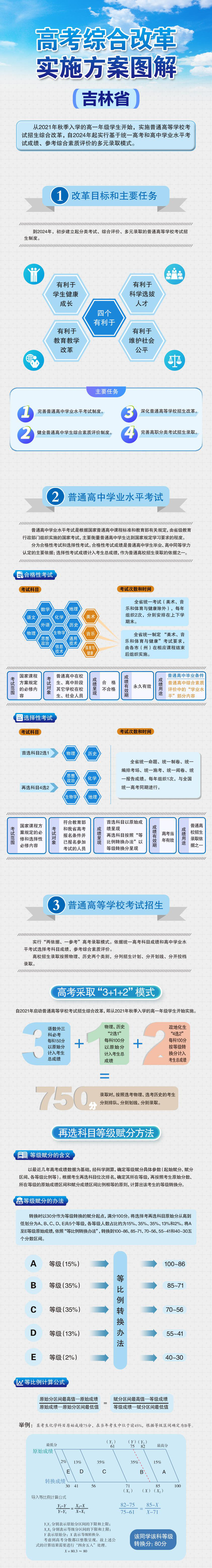 考生总成绩由统一高考科目成绩和学业水平考试选考科目成绩构成,满分750分。其中,统一高考科目语文、数学、外语使用原始成绩计入考生总成绩,每门满分150分。选考科目中,首选科目物理或历史使用原始成绩计入考生总成绩,每门满分100分;考生在再选科目思想政治、地理、化学、生物学中自主选择的2门科目按等级赋分后计入考生总成绩,每门满分100分。关于等级赋分转换办法在教育厅网站上有详细的图表化说明,帮助大家理解核心内容。