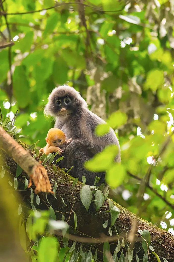 不知道有没有眼尖的小伙伴发现,菲氏叶猴宝宝和它的“爸爸”“妈妈”长得不一样。原来,猴宝宝在出生后的两、三个月的时间里毛发是金黄色的,之后的五、六个月开始走“低调”路线,毛发逐渐由金黄色变成灰色。哺乳期过后,小猴开始独立生活。