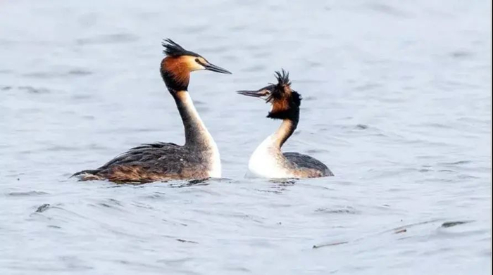 据介绍,当天这对䴙䴘配对没有成功,只进行了求偶仪式的前半部分。那怎么才算求偶成功呢?通常做完理羽动作后凤头䴙䴘还会调转方向,潜入水中,各自衔起一把水草,然后相互靠近,疯狂踩水,使整个身体都露出水面,像花样游泳选手那样。这样,求偶仪式才算正式落幕,配对才算真正成功。