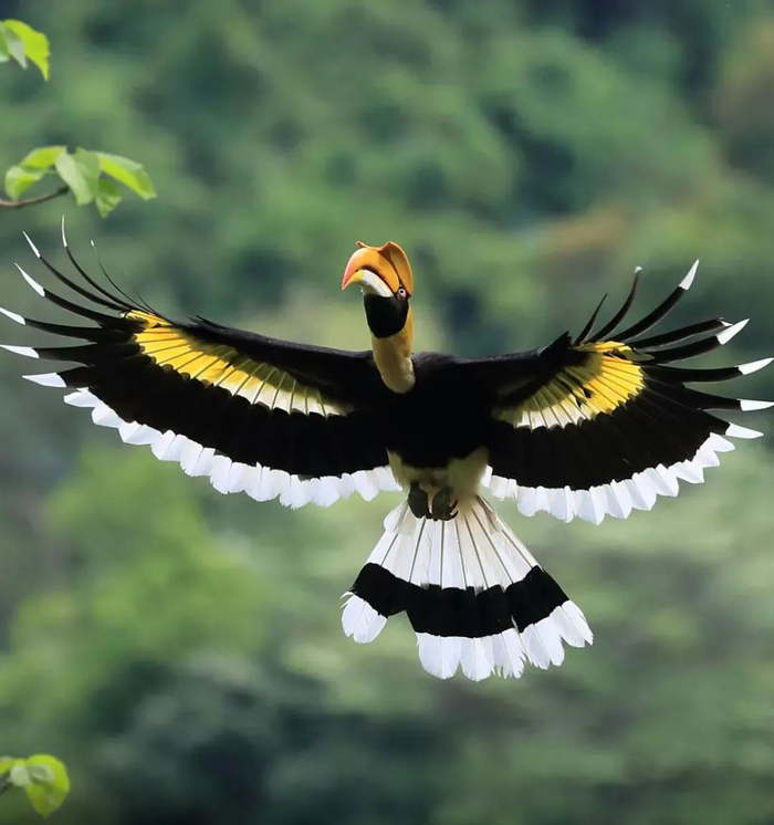 双角犀鸟是目前国内已知最大的一种犀鸟,因喙上黄色盔突中间微微凹陷,前缘形成两个角状突起,颇似犀牛鼻子上的角,故而得名。