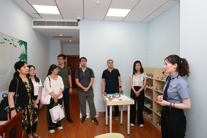上海市闵行区检察院检察官带领《未成年人司法社会工作服务标准》课题组专家参观该院心理疏导室。