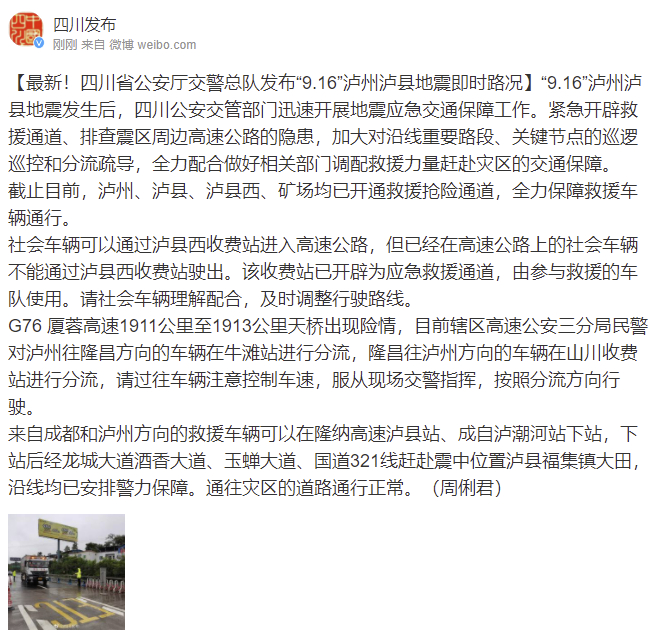 原标题:四川省公安厅交警总队发布“9.16”泸州泸县地震即时路况
