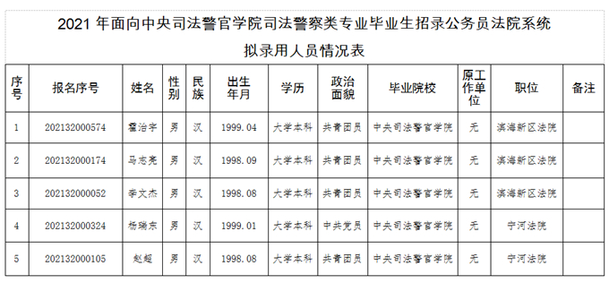 天津市法院系统2021年面向中央司法警官学院招录司法警察拟录用人员公示公告