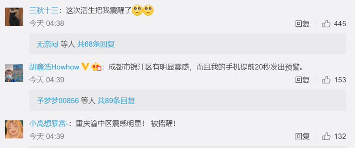 成都、重庆等多地震感明显,有不少网友称被地震晃醒。