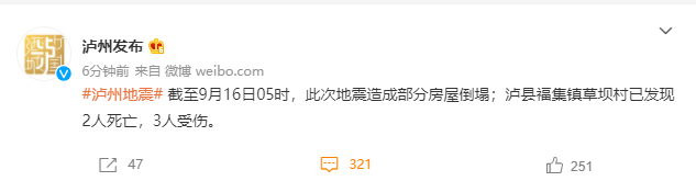 截至9月16日05时,此次地震造成部分房屋倒塌;泸县福集镇草坝村已发现2人死亡,3人受伤。
