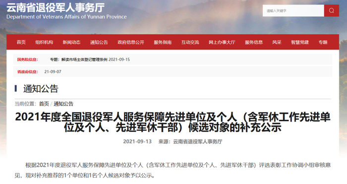 公示日期为2021年9月13日至9月17日。公示期间,如对被公示单位或个人有意见,可通过来信、来电、来访等方式向云南省退役军人事务厅反映。