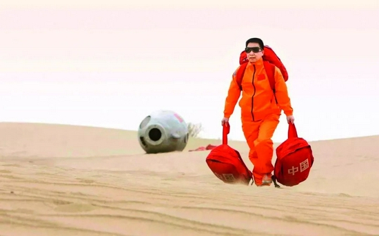 2003年10月16日6时23分,经过一天的太空遨游,神舟五号终于降落在内蒙古四子王旗阿木古郎草原腹地。经过一系列准备后,杨利伟顺利出舱。他曾经想象过这个场面,本来设计的出舱动作是向迎接他归来的首长和战友挥手致意。