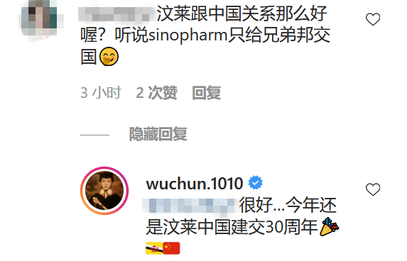 有人疑惑“中国与文莱关系这么好吗?”,吴尊回复道“很好”,还介绍道今年是“文莱中国建交30周年”。