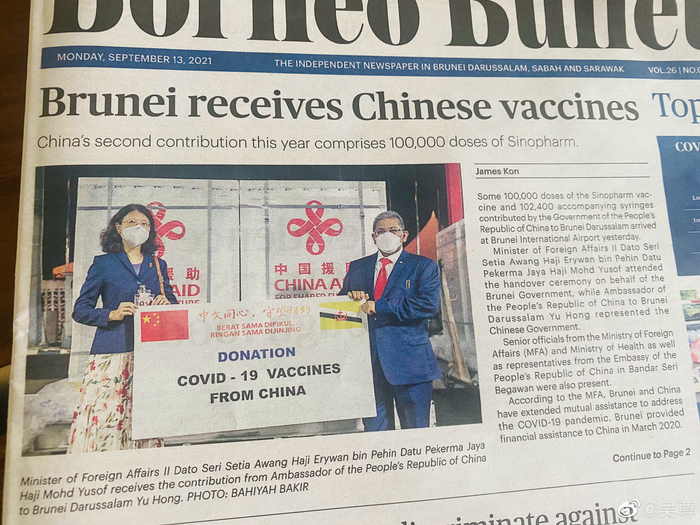 据中国驻文莱使馆官方网站消息,中国政府援助文莱政府的第二批10万剂中国国药新冠疫苗和10.24万只配套注射器,于9月12日晚顺利抵达文莱斯里巴加湾国际机场,在当地受到高度关注和热烈欢迎。文莱国家广播电视台、《婆罗洲公报》、《灯塔报》、《宝石报》等当地主流媒体都纷纷报道。