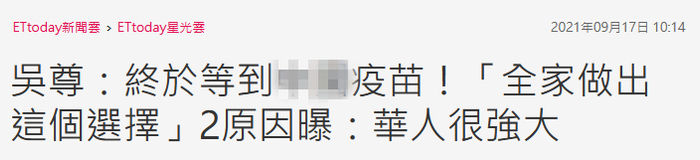 今天上午(17日),文莱华裔、中国台湾偶像组合“飞轮海”前队员吴尊在微博表示,自己和家人都已接种来自中国的新冠疫苗,“终于有机会等到中国的疫苗,一家都做出这个选择,因为比起其他国家,中国把疫情控制的太好了。”