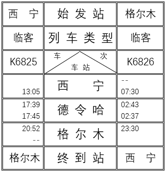 2021年9月18日、25日、26日、27日、30日西宁至格尔木间加开K6825次临时旅客列车;9月18日、25日、26日、27日、30日格尔木至西宁间加开K6826次临时旅客列车。