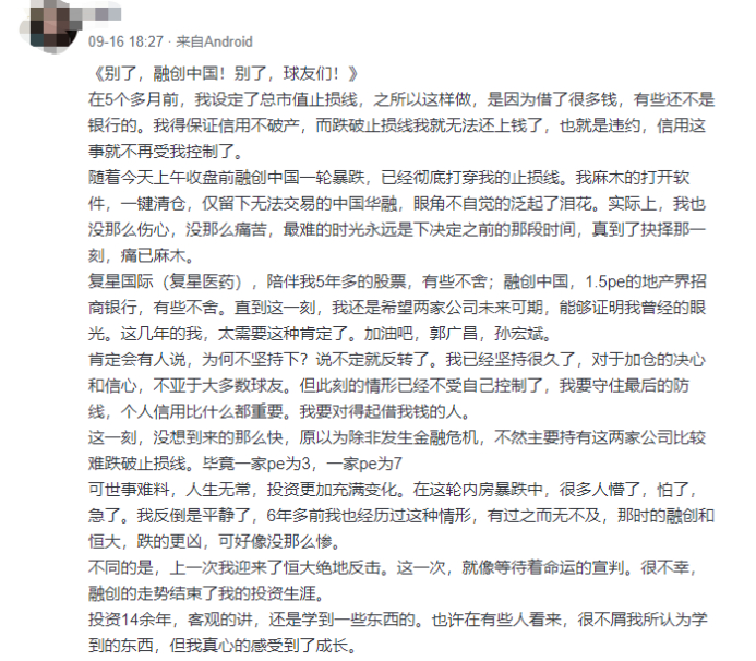 9月16日,在股票投资交流社区,网友自曝称,因为借了很多钱,为保证信用不破产,一键清仓了其融资买入的股票——融创中国。