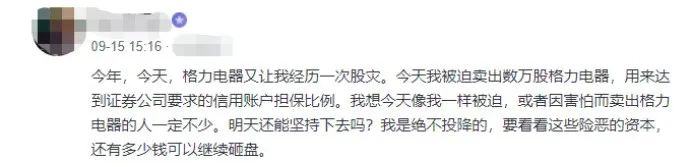 有同样经历的还有格力电器的投资者,近日,在格力电器股票投资交流社区中,有网友称,格力电器又让其经历一次股灾,其融资买入的格力电器被迫卖出,用来达到证券公司要求的信用账户担保比例。