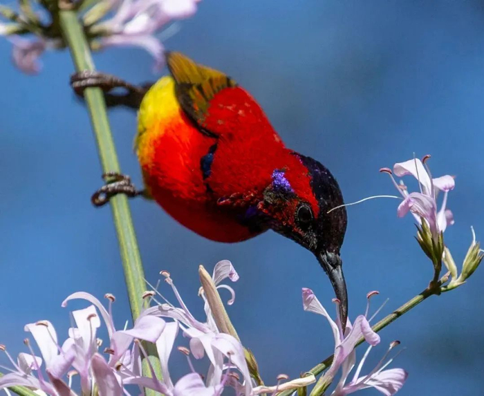 鸟儿也爱“采”花蜜!蓝喉太阳鸟林间觅食