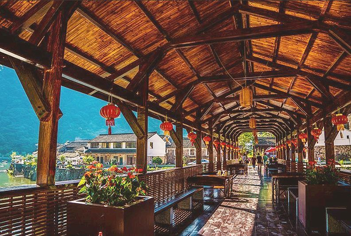 整个村子散发着柔和温软的气息,很容易就能让人安静下来。一条宽阔的溪坑穿村而过,横跨溪上的四明廊桥是村民们的自由场。晒太阳、躲雨,不时向游客叫卖着自家土特产,空灵的烟火气在这个古村袅袅升起。