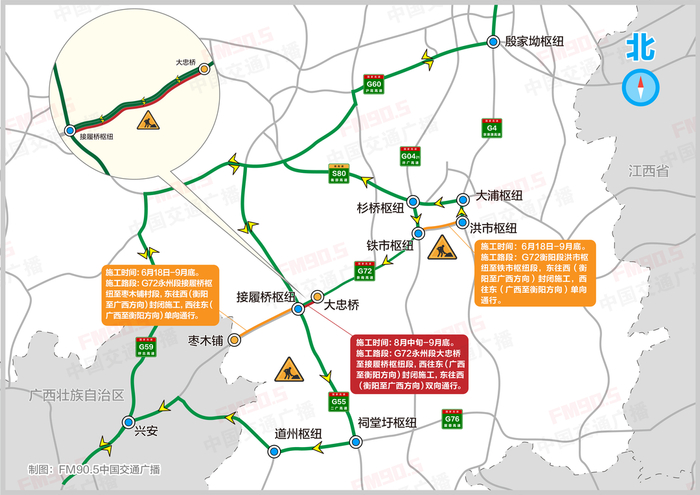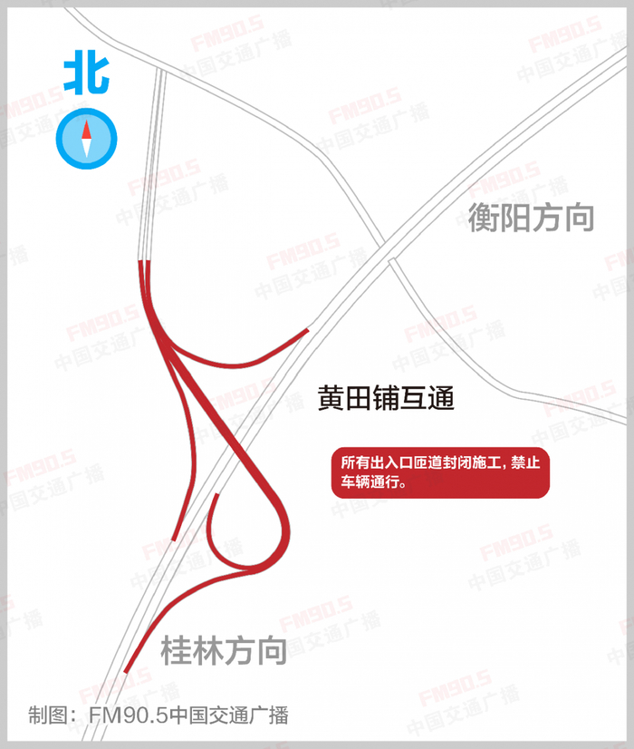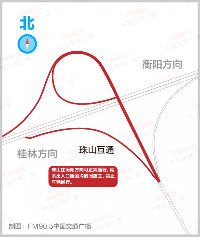 施工路段及交通组织方式:1、洪市枢纽至铁市枢纽段:北幅封闭施工,南幅(西往东)单向通行。2、大忠桥互通至接履桥枢纽段:南幅封闭施工,北幅双向通行。3、接履桥枢纽至K936+000段:北幅封闭施工,南幅单向(西往东)通行。4、K936+000至黄田铺互通段:南幅封闭施工,西往东方向车辆借道北幅通行。5、黄田铺互通至珠山互通段:北幅封闭施工,南幅单向(西往东)通行。6、珠山互通至枣木铺村段:南幅封闭施工,西往东方向车辆借道北幅通行。7、珠山互通:珠山往衡阳方向可正常通行,其余出入口均封闭施工,禁止车辆通行。8、黄田铺互通:所有出入口匝道封闭施工,禁止车辆通行。9、大忠桥互通:桂林往大忠桥方向(西往东)出口封闭施工,禁止车辆通行;大忠桥往衡阳方向入口封闭施工,禁止车辆通行。