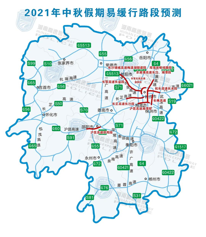 G0401长沙绕城高速梅溪湖隧道路段、观音岩枢纽路段;S21长株高速;S50长芷高速长沙段。