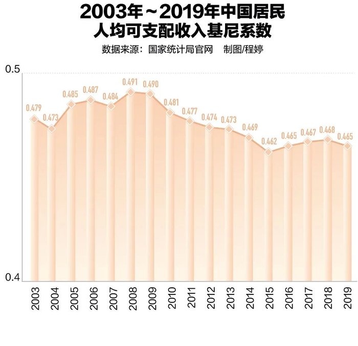 国家统计局公布的数据显示,2019年中国的居民人均可支配收入基尼系数为0.465,处于较高水平,明显高于0.4的国际警戒线。事实上,自国家统计局公布了全国收入差距基尼系数的起始年份(2003年)至2019年,中国的基尼系数始终在0.4之上;而据学术界的研究,上世纪90年代以后中国收入差距的基尼系数就已超过0.4。