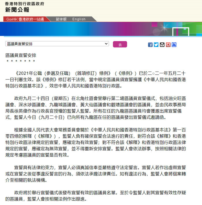 原标题:港府公报:将于9月24日举行第二场区议员宣誓仪式