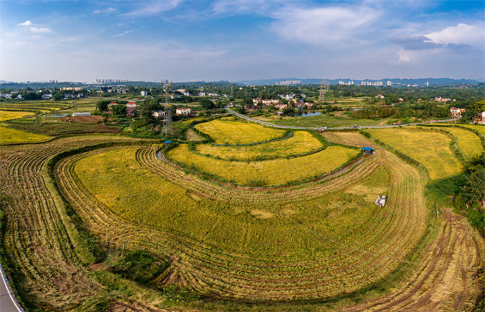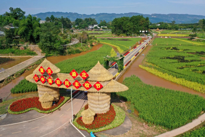 来自江北区的800多名干部群众及涉农企业代表参与节日庆祝活动,共同分享丰收的喜悦与幸福。赵乾 摄九龙坡西彭镇新民村金黄色的稻田。陈林 摄