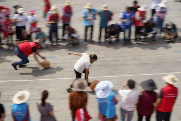 9月23日,巫山县双龙镇安静村,村民们在参加趣味运动会滚南瓜比赛。当日,为庆祝中国农民丰收节,一场别开生面的趣味运动会在安静村举行,来自该村的100余名村民参加了搓包谷、滚南瓜、套鸡、徒手抓鱼等趣味比赛,现场一片欢乐,村民们在加油声、欢笑声中喜迎丰收。牛强 摄/视觉重庆
