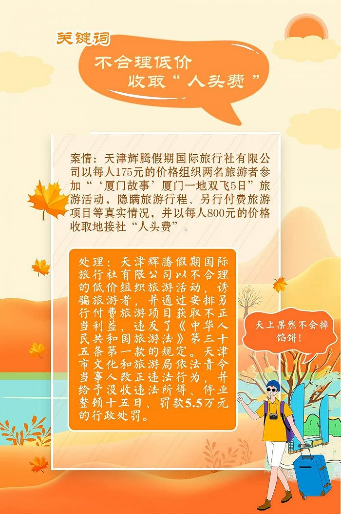 为进一步加强社会监督,规范旅游市场经营秩序,文化和旅游部公布了专项整治行动第四批指导案例,包括以康养活动招徕旅游者、购物送旅游、网络招徕、旅拍、“不合理低价游”的执法案例。国庆节将至,文化和旅游部提示广大旅游者审慎甄别旅游产品,理性选择合法正规的旅游服务,自觉抵制“不合理低价游”,保障自身安全和合法权益。欢迎社会公众通过举报电话12318和举报平台jbts.mct.gov.cn对违法违规旅游市场经营活动进行举报监督。