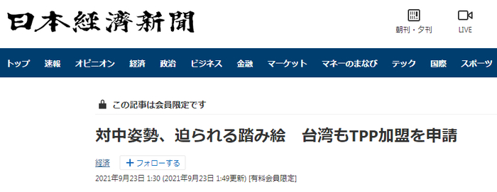 《日本经济新闻》:台湾申请加入CPTPP,围绕对中国的态度,CPTPP成员国被迫“站队”