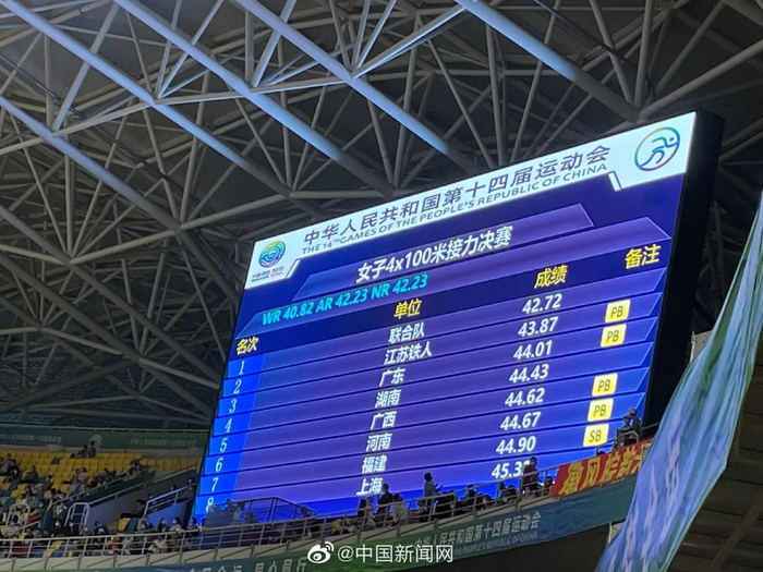 全运会男子4 x100米接力大战24日上演,当晚比赛遇上下雨,跑道较为湿滑,但由汤星强、谢震业、苏炳添、吴智强组成的奥运联合队还是毫无悬念地夺冠,成绩是38秒50。这是苏炳添本届全运会上继男子100米单项后拿到的第二枚金牌。为他们加油!